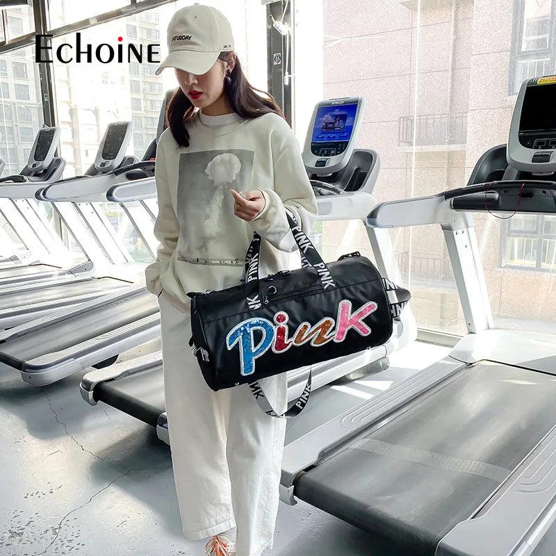 Echoine Laser Sequin PINK Letter Print Woman Casual Travel Sports Gym Bag