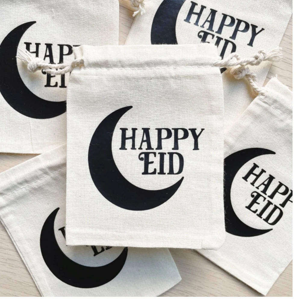 Celebrate Eid in style with these personalized fabric pouches. Perfect for gifting money or small trinkets to kids. Each bag features a festive Eid design and a convenient drawstring closure.
