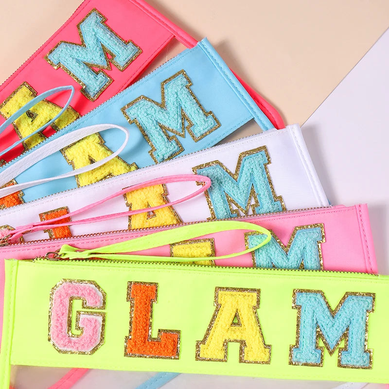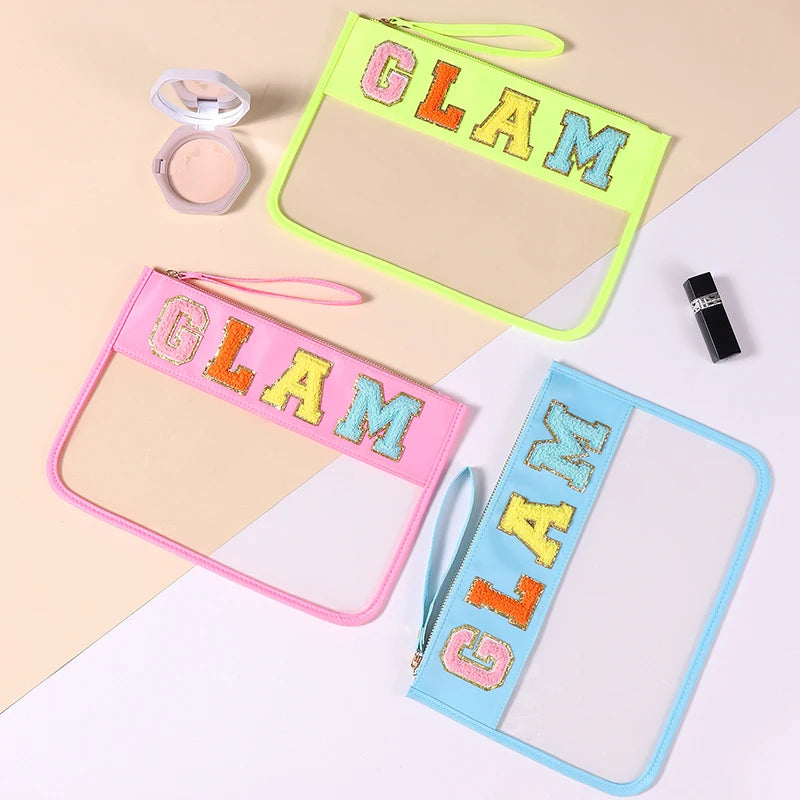 Stylish and practical cosmetic bag made of solid towel embroidered nylon with PVC lining. Large capacity for storing cosmetics and toiletries. Perfect for daily use or travel.