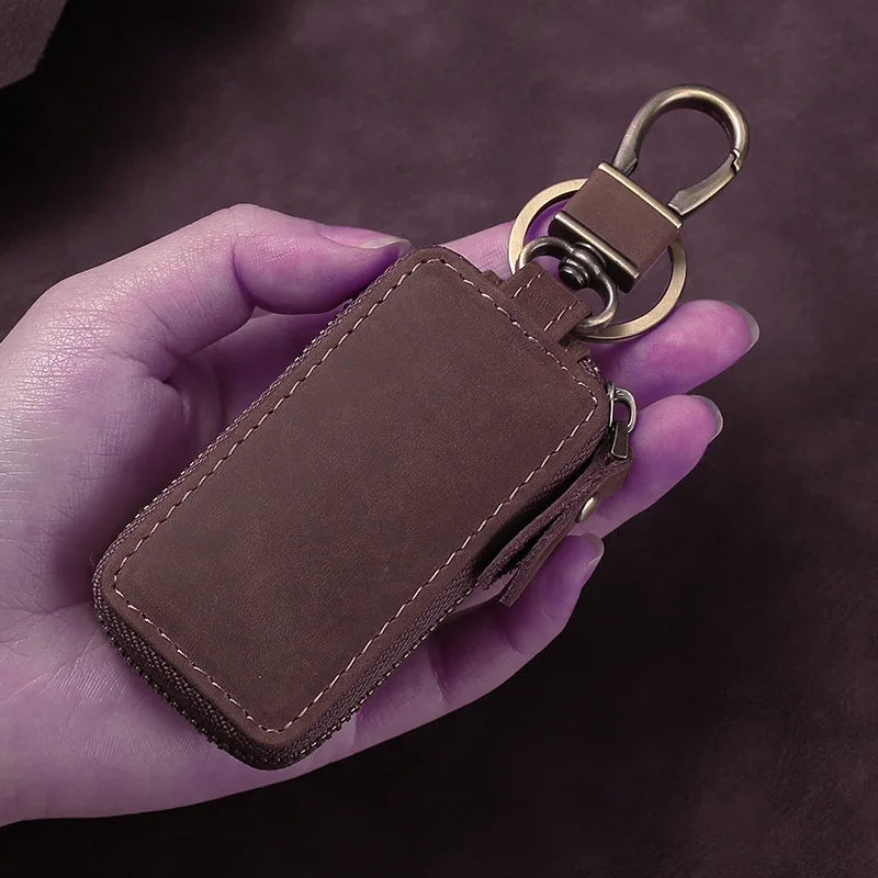 This versatile key holder bag is made of high-quality first layer cowhide leather, suitable for both motorcycle and car keys. It features a zipper closure and can be worn on the waist or hung in your vehicle.