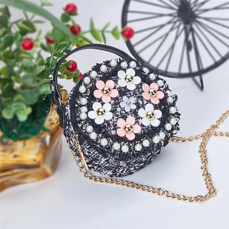 This stylish shoulder bag features a floral decoration, perfect for girls. It can be used as a portable round chain diagonal bag.
