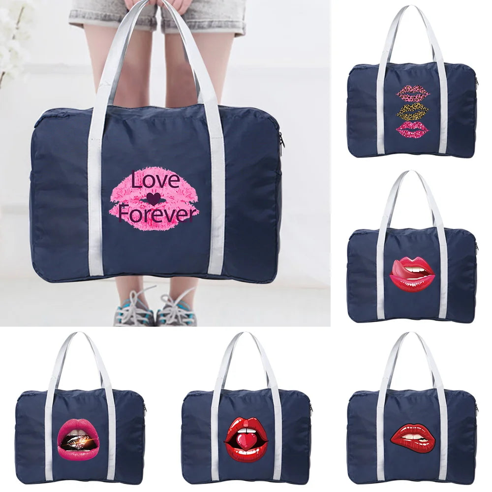 This unisex travel bag is perfect for organizing your belongings. It features a foldable design, large capacity, and a printed mouth design. Ideal for travel.