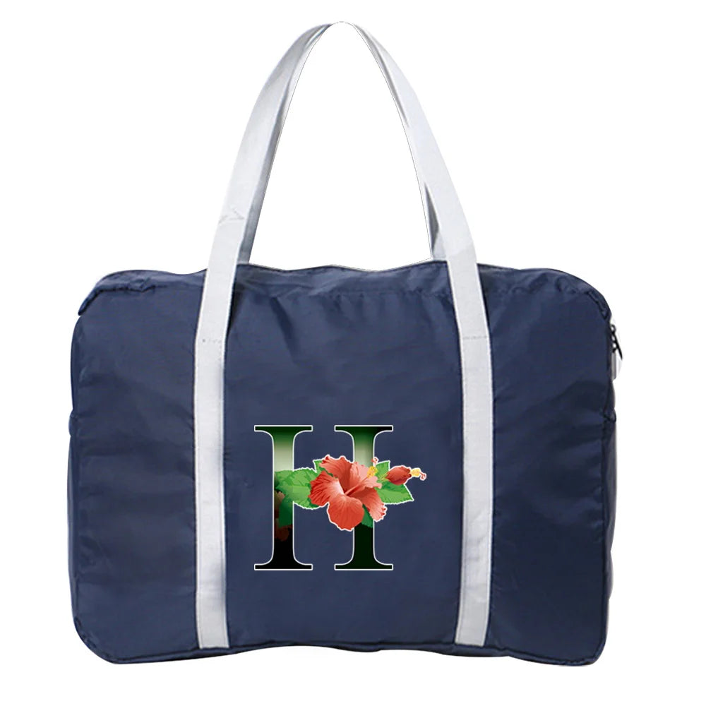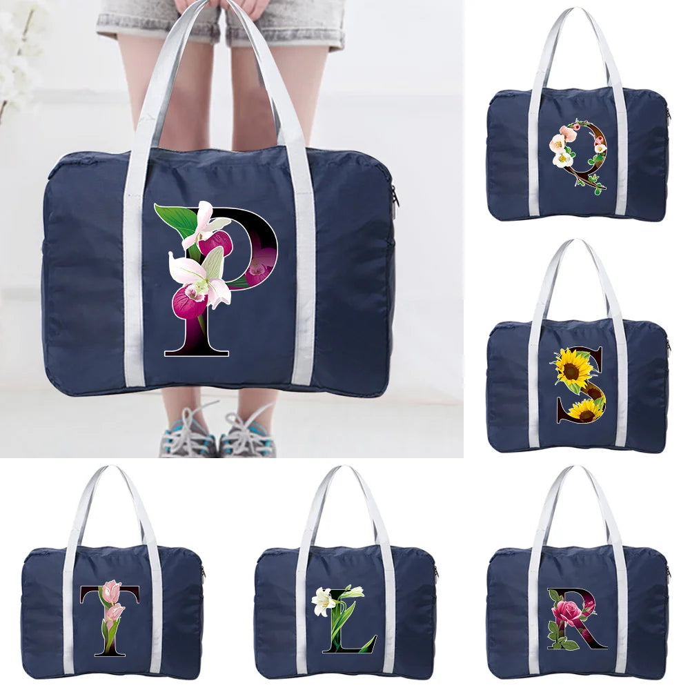 This large capacity travel bag is perfect for organizing your belongings while on the go. It features a stylish flower and letter print design, making it a fashionable choice for your travels.