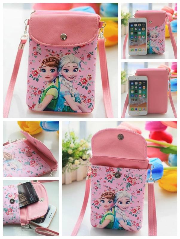 This mobile phone bag is designed with a Frozen Princess theme, featuring Elsa. Made of PU leather, it's perfect for girls and ladies to carry their coins or small items.