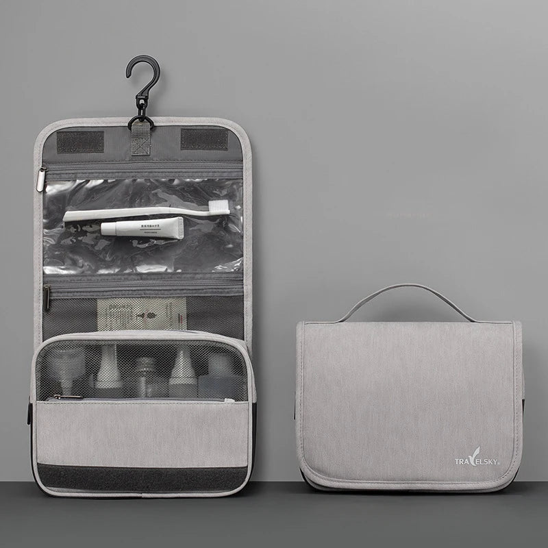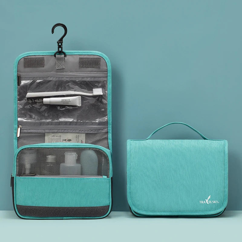 This versatile toiletry bag is perfect for storing makeup, toiletries, and accessories. It features a hanging design for easy access and organization while traveling.