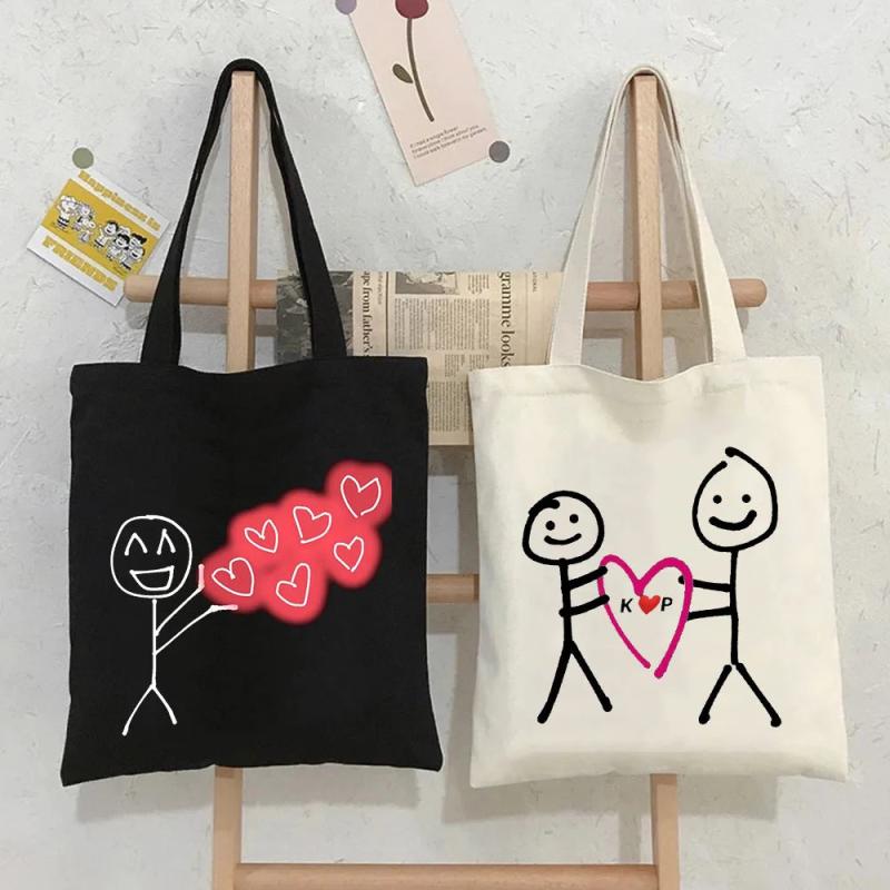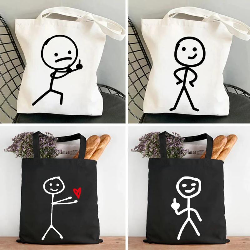 Funny Couple Line Art Stick Figures Women Eco Shoulder Reusable Totes