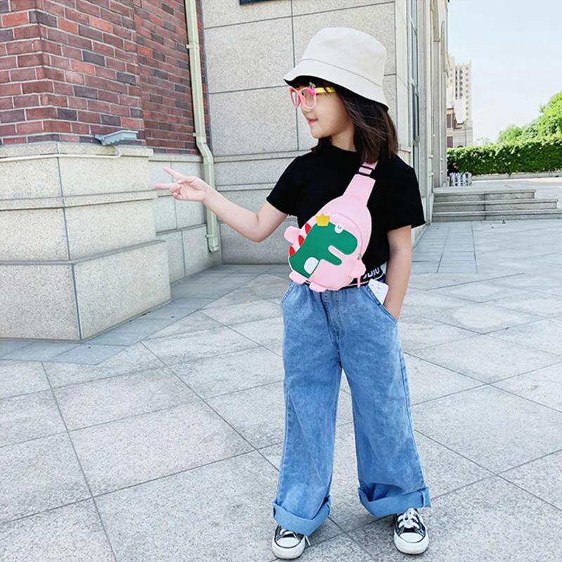 This adorable waist bag features a baby cartoon dinosaur design, perfect for girls and boys. It has a zippered pouch for money or small items.