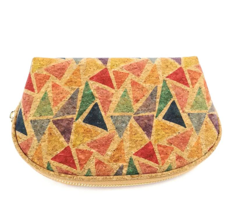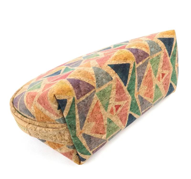 Keep your beauty essentials organized and stylish with this geometric pattern cork pouch. Perfect for storing lipstick, brushes, and other items.