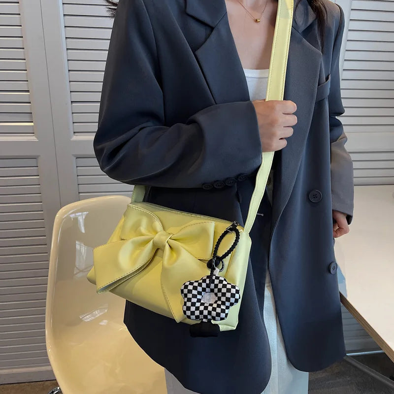 This adorable small square bag features a sweet bow design, perfect for a fashionable look. Wear it as a cross-body or under the arm bag for added style.