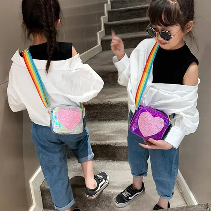 This adorable mini crossbody handbag is perfect for little princesses! Made of PU leather, featuring a rainbow and love design. Ideal for storing coins and small items.