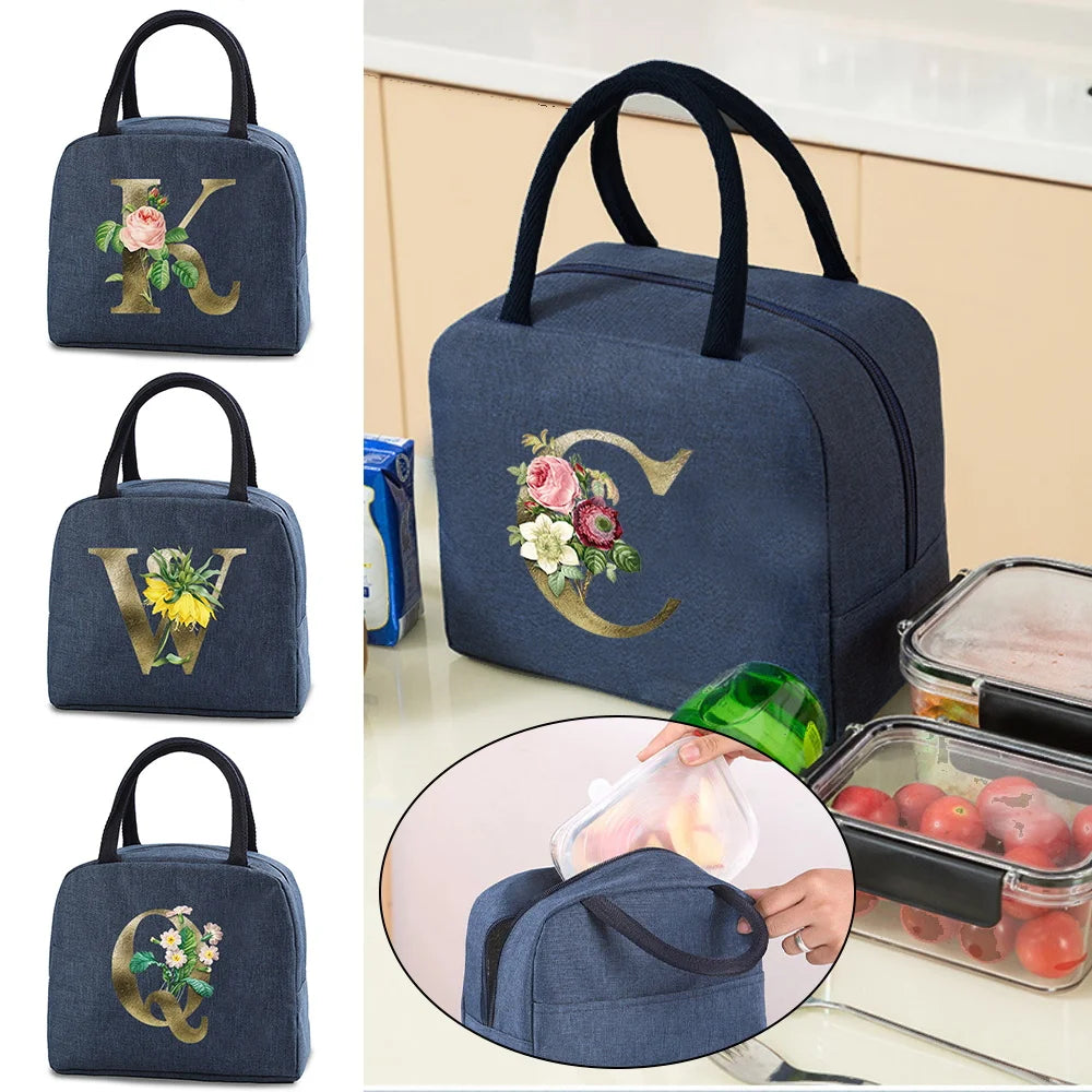 Golden Flower Print Insulated Lunch Bag - Thermal Bento Tote