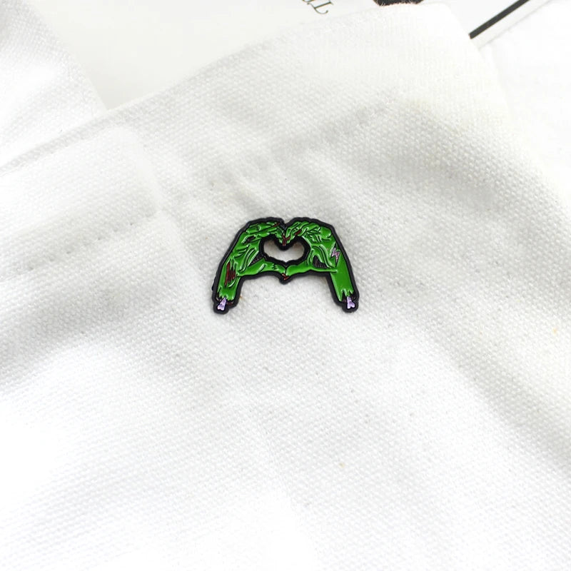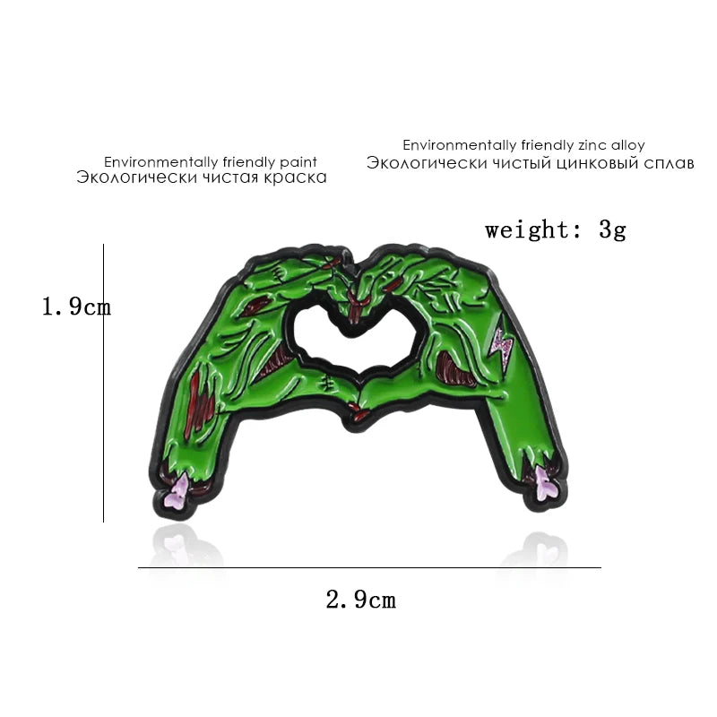 Add a spooky touch to your outfit with this green skull hands skeleton brooch. Perfect accessory for denim, shirts, bags, and Halloween events.