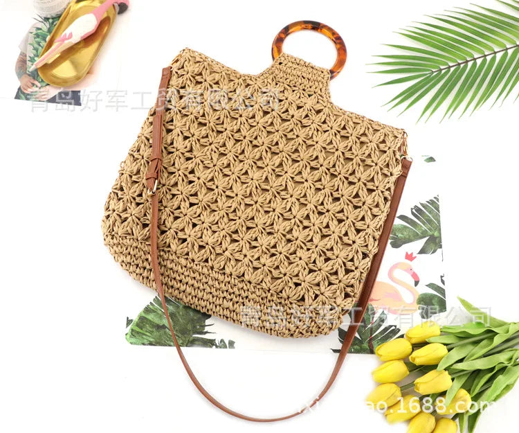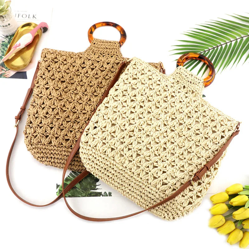 This hand-held paper rope crochet bag is perfect for a day by the beach or casual outings. The shoulder woven design adds a stylish touch to your outfit.