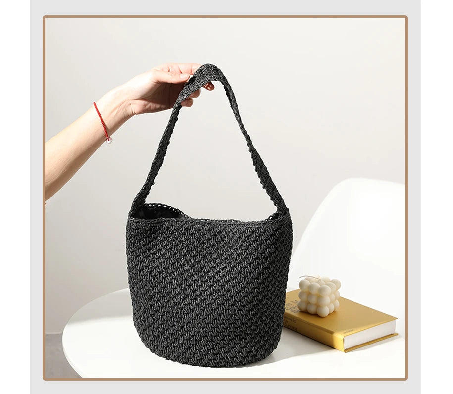This hand-woven straw bucket bag is perfect for your seaside vacation or beach trip. It features a stylish design and ample space for your essentials.