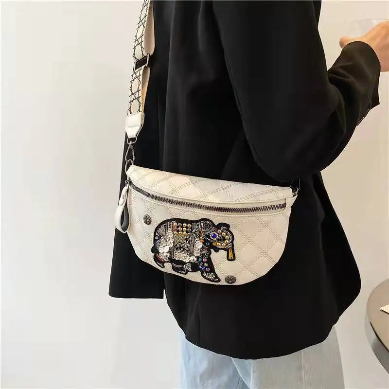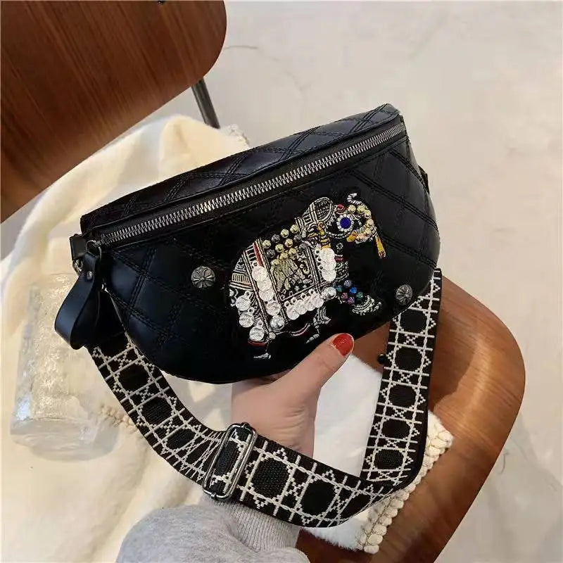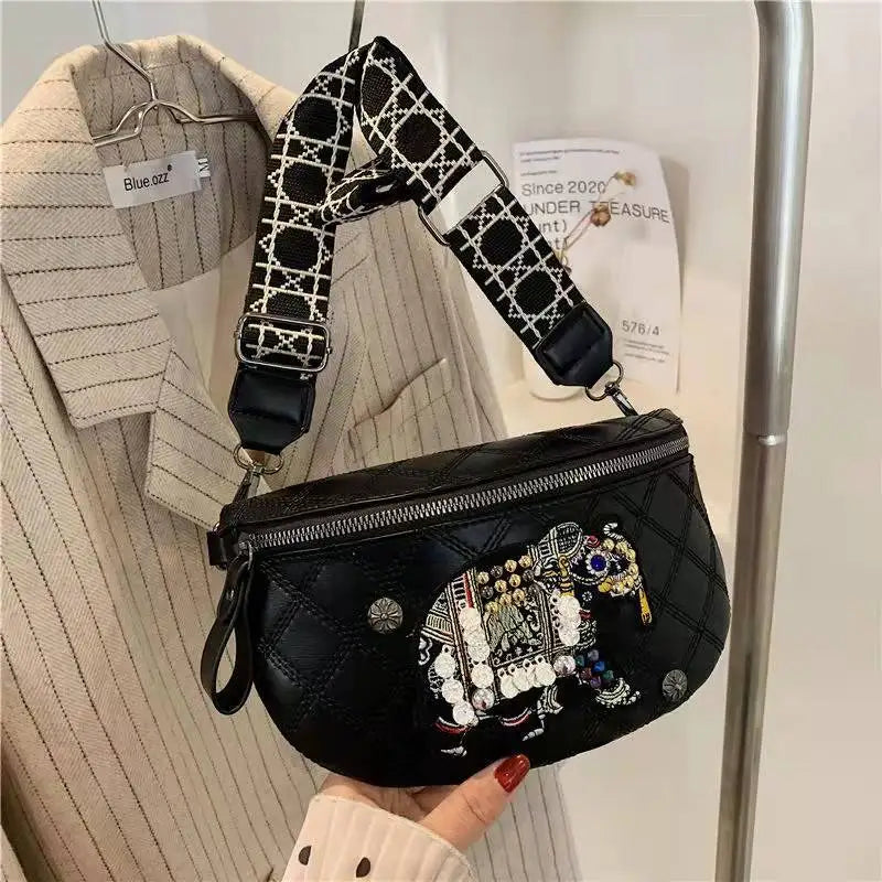 Elevate your style with this fashionable western elephant embroidery shoulder bag. It can be worn as a shoulder strap, messenger bag, or waist bag.
