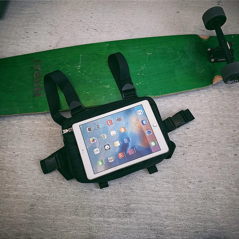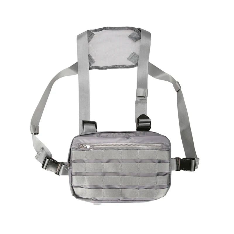This stylish chest rig bag features a punk streetwear design, functional tactical military vest, and cross shoulder bag. Inspired by Kanye West, it's a versatile waist pack for urban fashion.