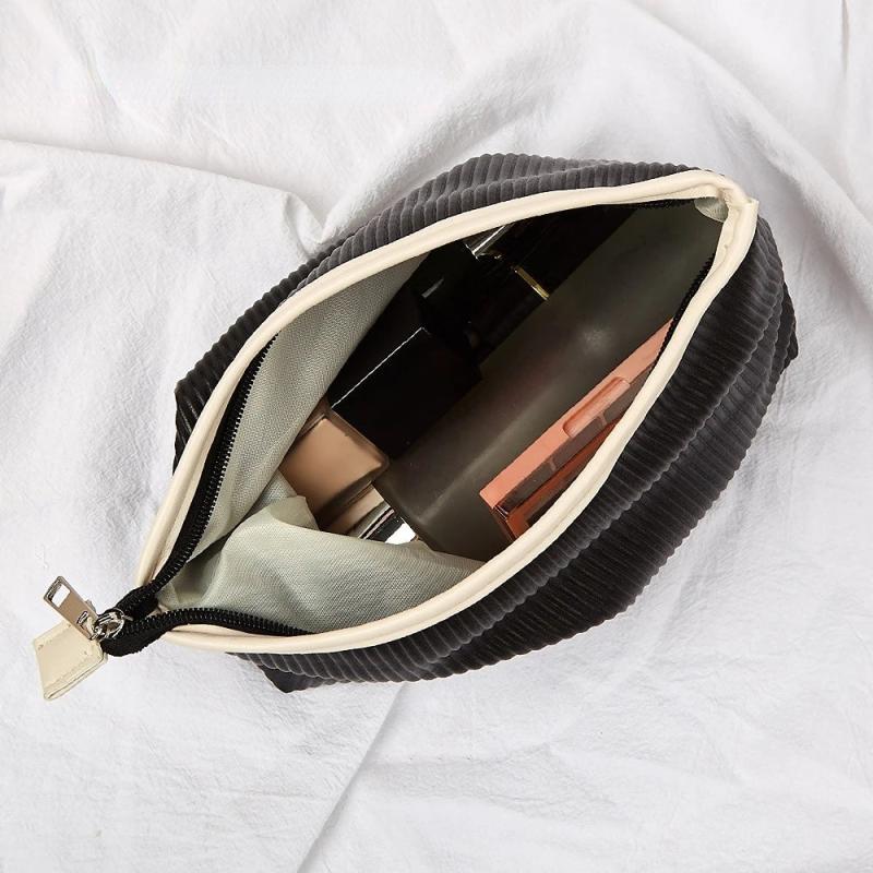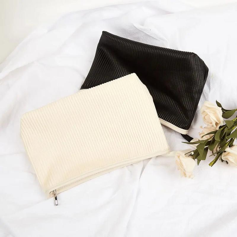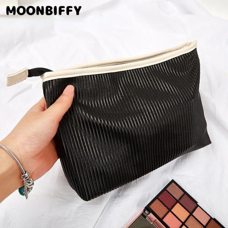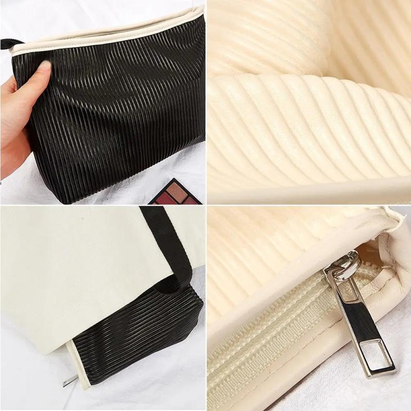 This pleated PU cosmetic bag is designed in a Japanese style, featuring personalized details. It is a portable toiletries bag that provides light storage for your essentials.