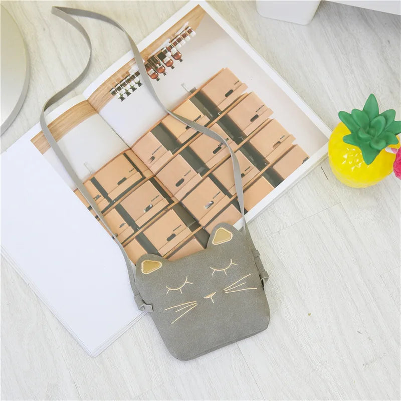 Adorable children's messenger bag featuring a cat design, perfect for your little girl. Made of matte leather with a small shoulder strap. Ideal for carrying small items like coins or trinkets.