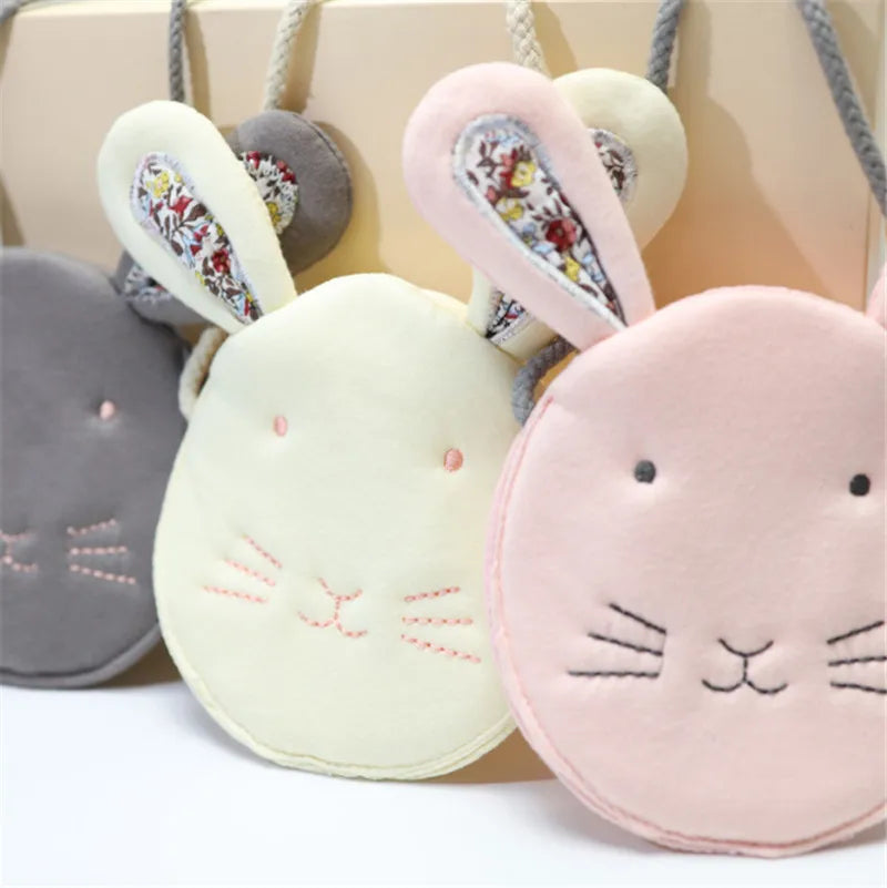 This adorable children's cloth bag features a cute rabbit design in pink, beige, and grey colors. The small size is perfect for little ones to carry their essentials.