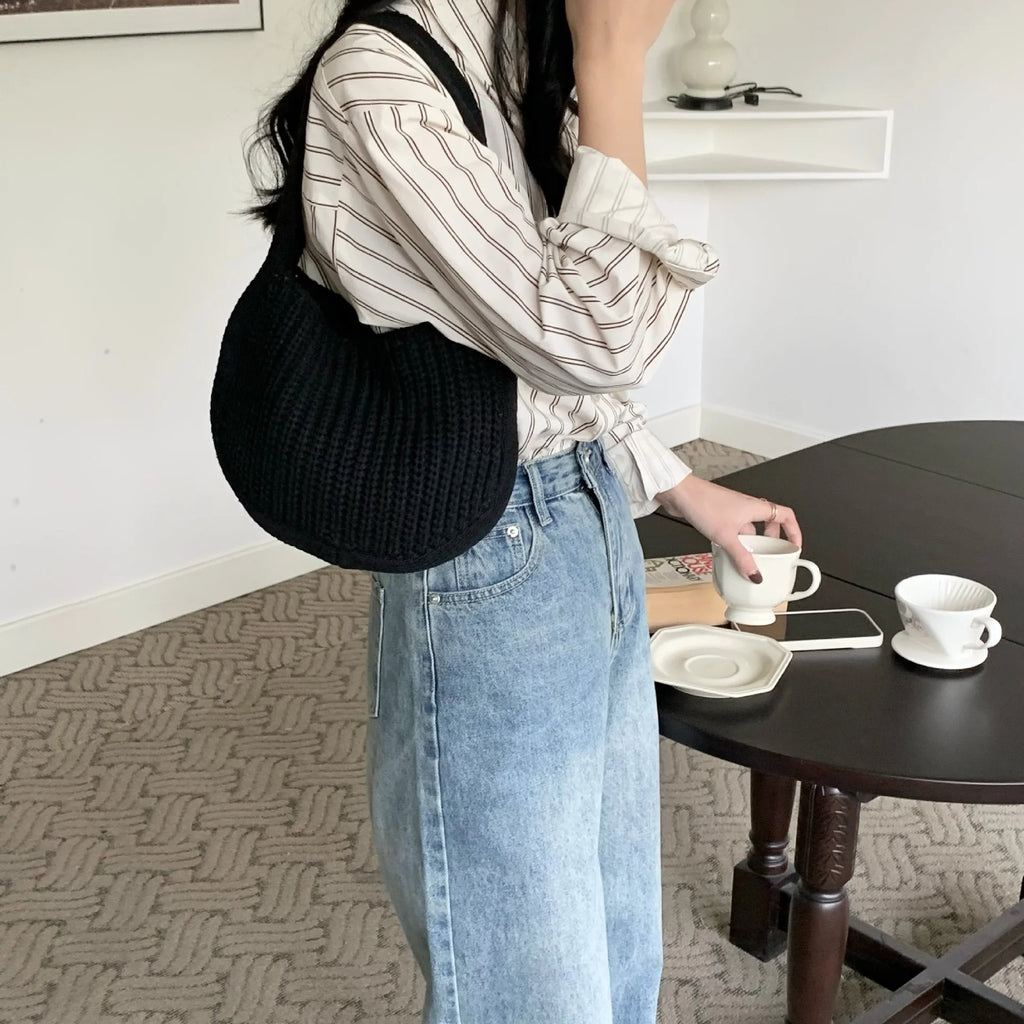 Knitting Wool Shoulder Bag Round Bucket Style for Women