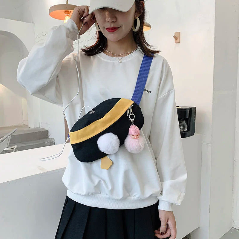 This chest bag is designed in Korean INS style with a touch of Japanese Harajuku fashion. Ideal for students and girls, it offers a wild and trendy look. Made of durable canvas material.