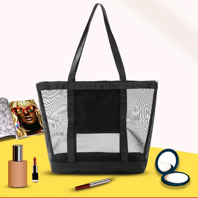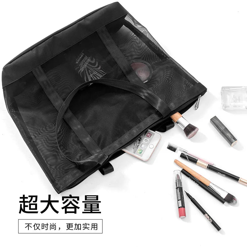 - Spacious mesh bag for beach, travel, swimming, fitness, and cosmetics