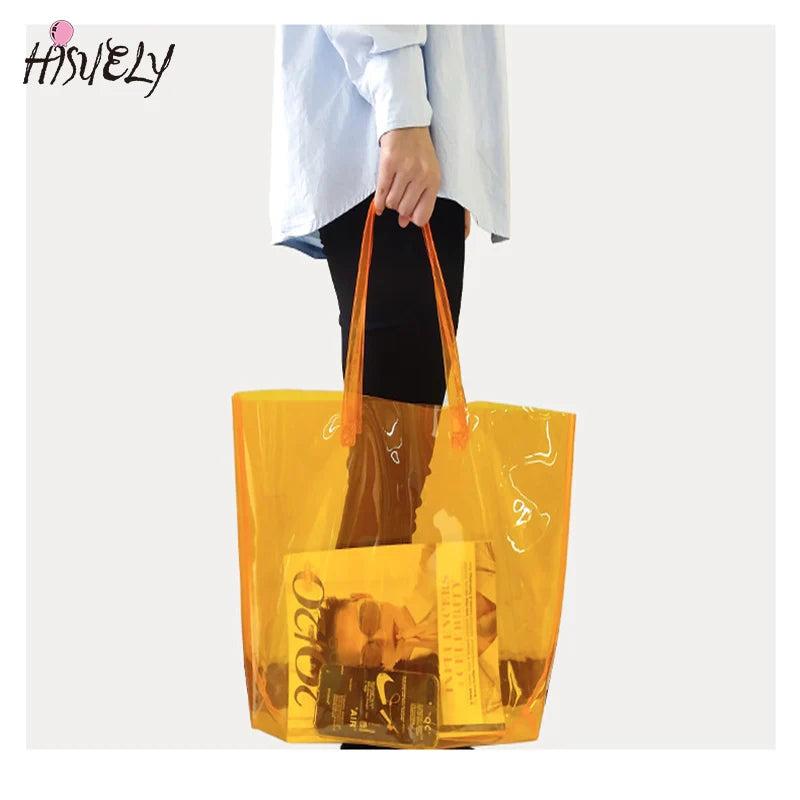 Stay trendy with this transparent tote bag featuring a hologram design. Perfect for beach trips, shopping, or everyday use.