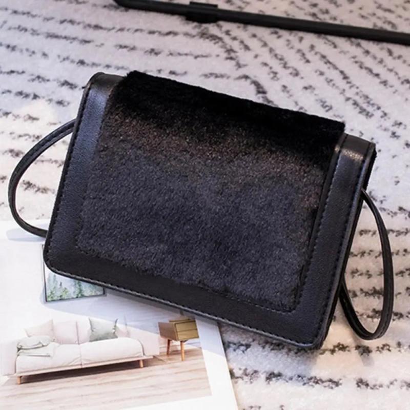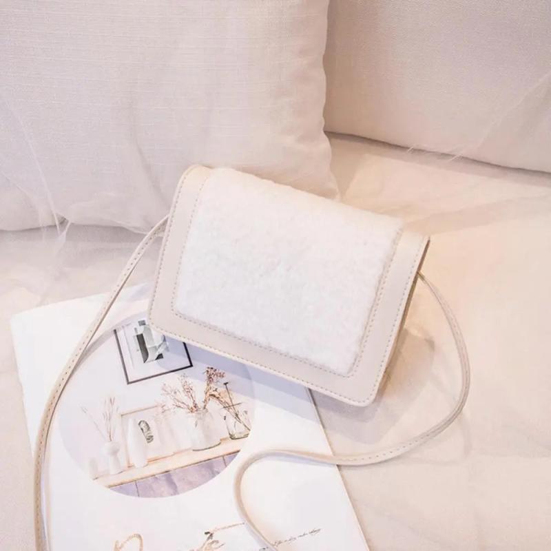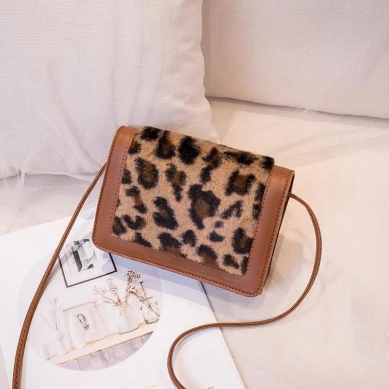 Stay trendy with this small square bag made of rabbit fur in a stylish leopard print design. The one-shoulder phone pouch is perfect for carrying your essentials in a fashionable way.