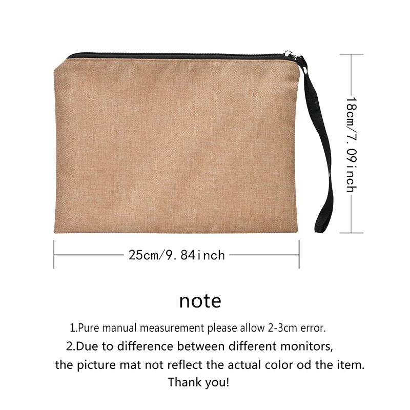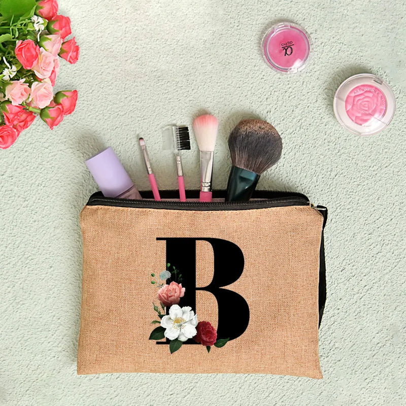 This stylish linen clutch bag is perfect for carrying your makeup essentials while traveling. The letter print adds a trendy touch to the design.