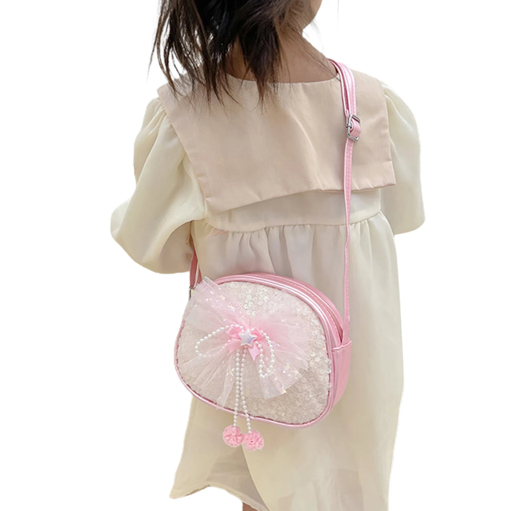 Little Girls Sequin Bow Messenger Bag with Pearl Pendant Zipper