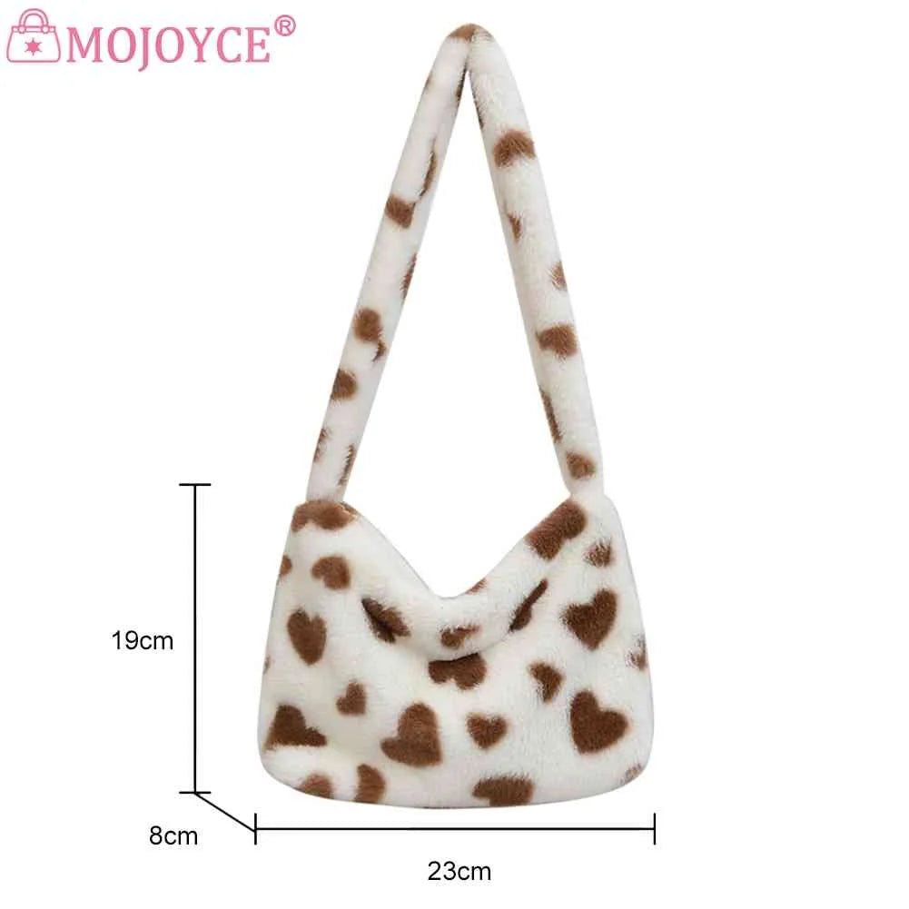 Stay stylish and cozy with this plush shoulder bag featuring a love heart print. Perfect for autumn and winter outings and parties.