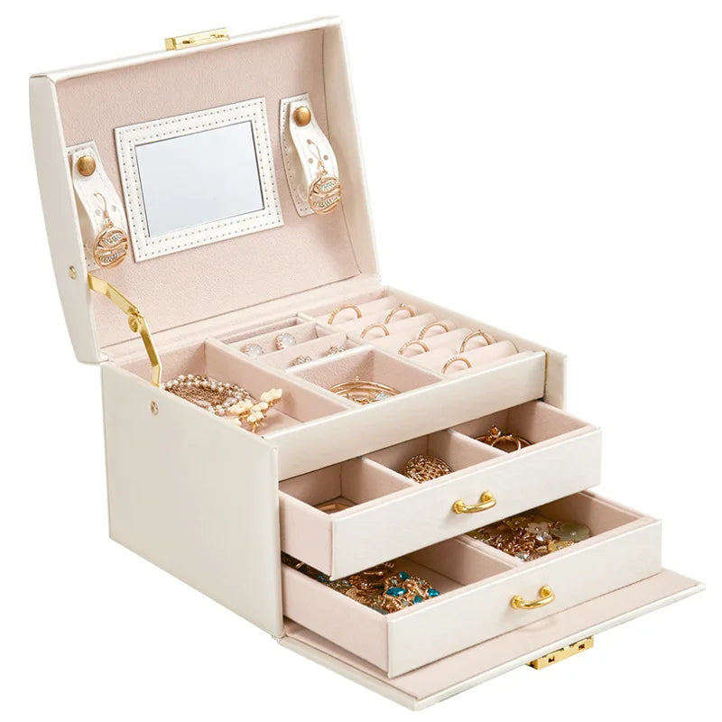 This three-layer jewelry storage box is perfect for organizing your makeup and jewelry items. The PU leather material adds durability and style.