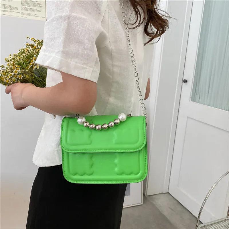 Stay stylish on-the-go with this mini pearl chain crossbody bag. Perfect for carrying your essentials like lipstick and keys.