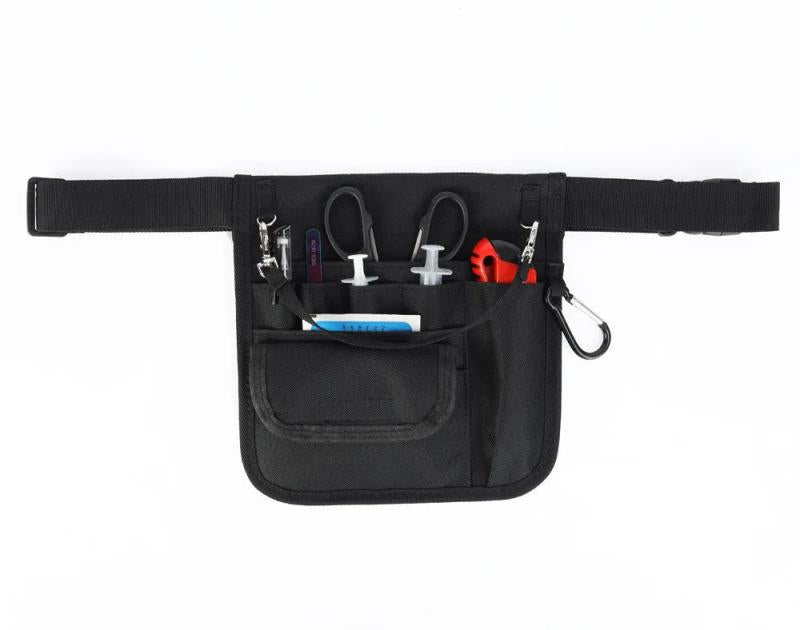 Convenient medical organizer belt for nurses featuring multiple compartments to store medical gear and care kit essentials.