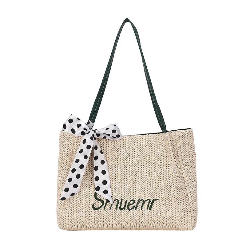 This one-shoulder beach bag is perfect for carrying all your essentials in style. Made of straw woven material, it offers a large capacity and is portable for beach outings.