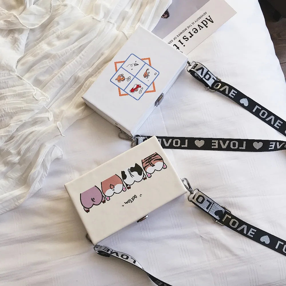 This one-shoulder bag features a wide strap, female revenue stamp printing, and a box casket design. Perfect for students and daily use.