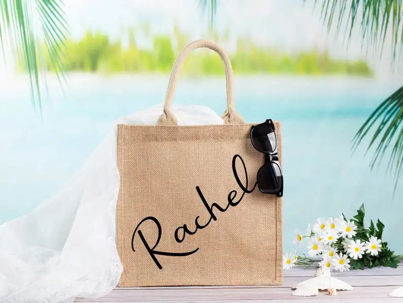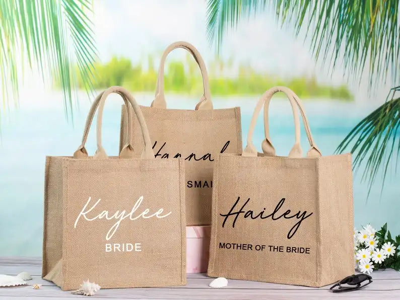 Get this custom burlap tote bag for the bride and bridesmaids. Perfect for weddings or beach trips. Personalize it with your choice of text. A thoughtful gift idea.