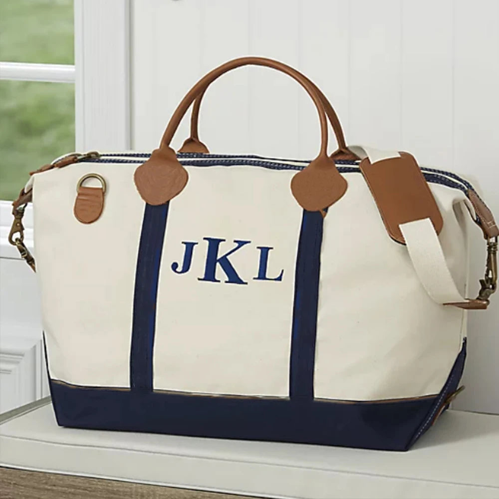 This stylish canvas duffle bag is perfect for your holiday travels. Personalize it with your monogram and embroidered name. Great gift for ladies.