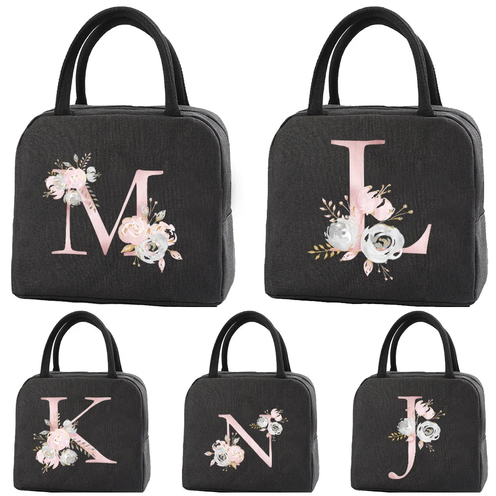 Pink Flower Letter Print Lunch Bag Cooler Tote Insulated Thermal Canvas