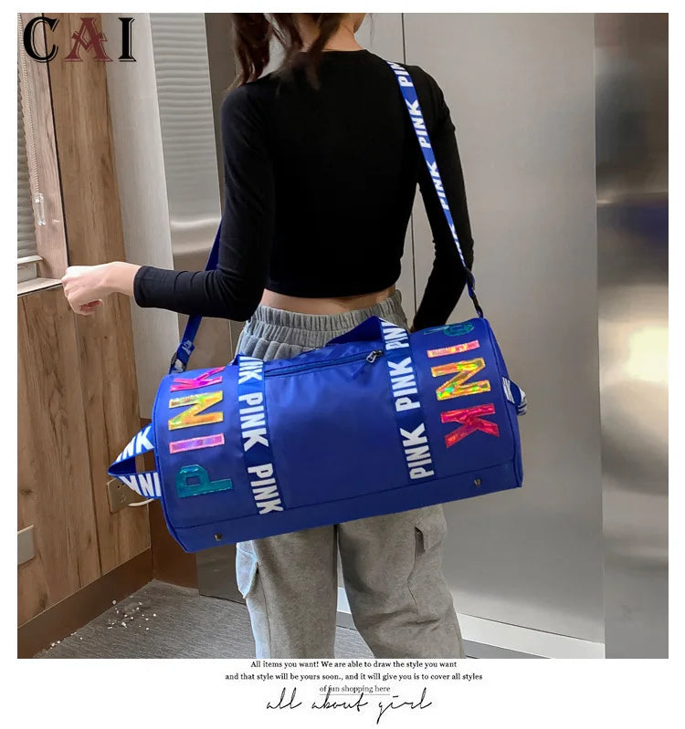 Stay stylish and organized with this pink travel bag perfect for gym sessions or sports activities. It features a letter printing design and is portable and convenient to carry.