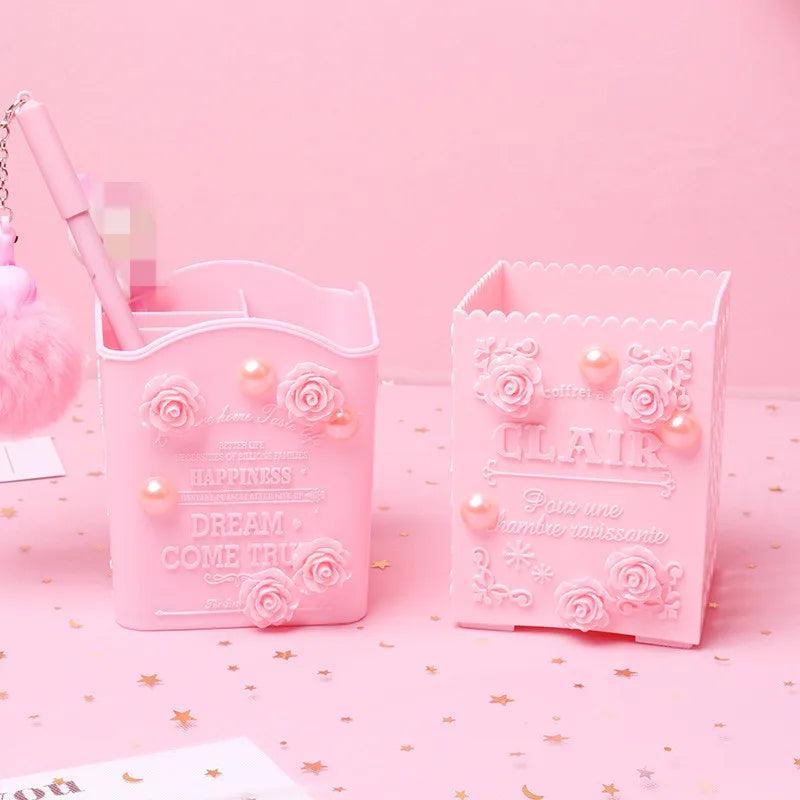 Pink Rose Flower Makeup Box Organizer Student Desktop Storage Bucket