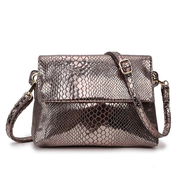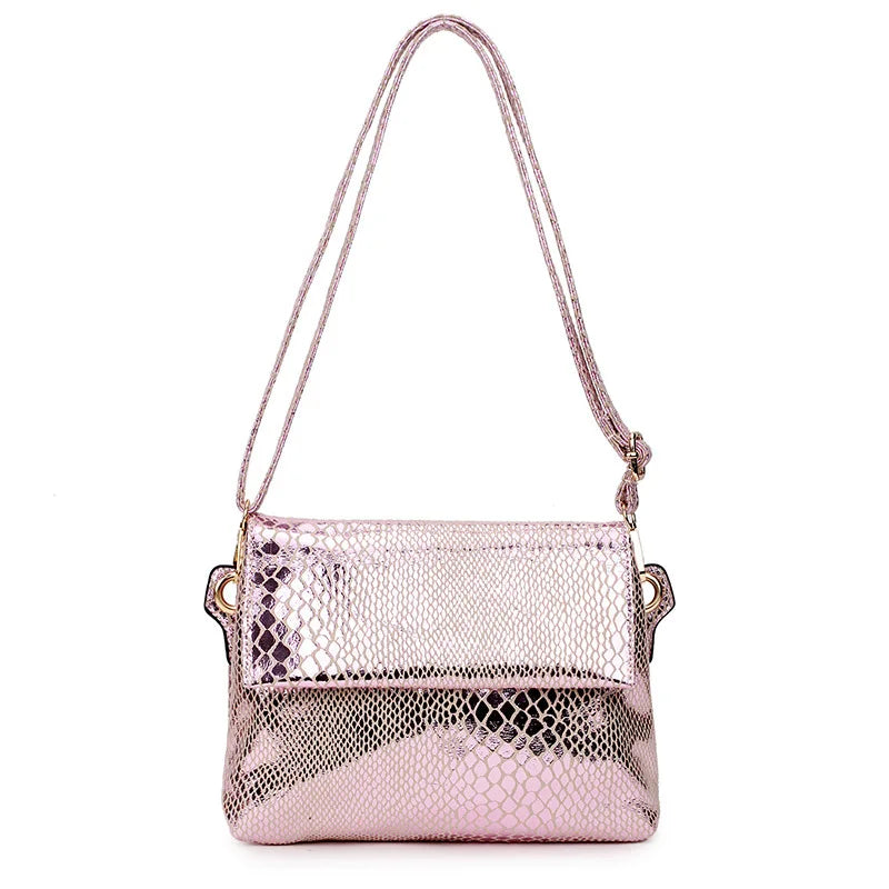 This stylish pink crossbody bag features a snake print design and is made of soft leather. It's perfect for carrying your essentials with ease.