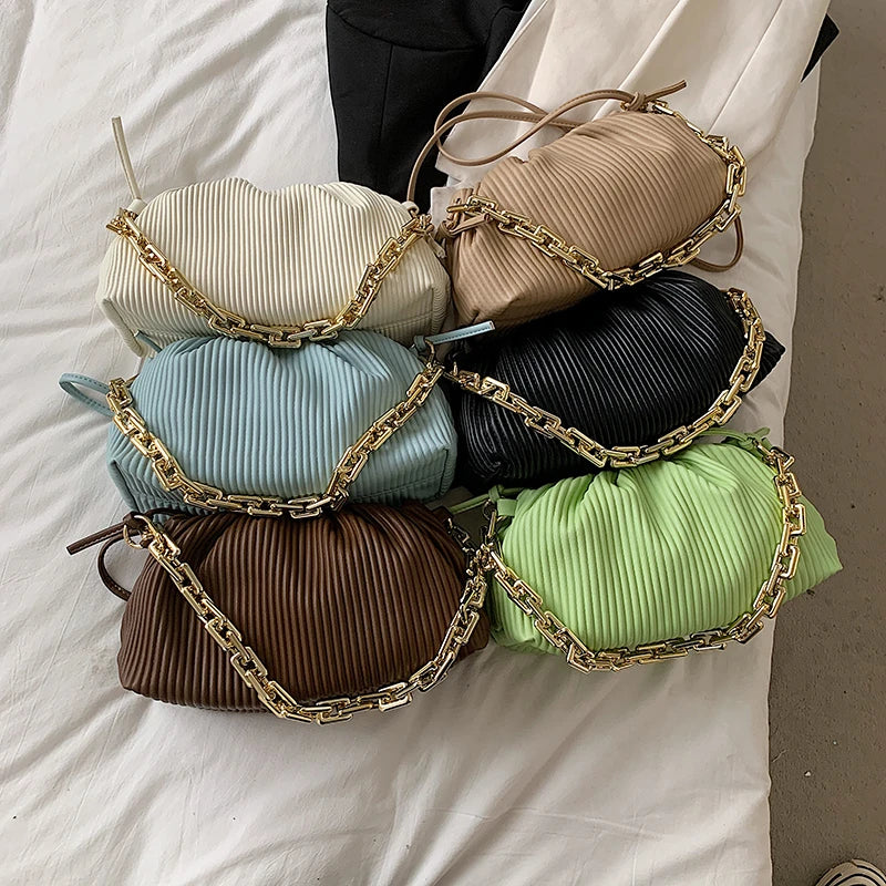 This stylish bag features a pleated underarm design with a thick chain strap, perfect for versatile carrying options.