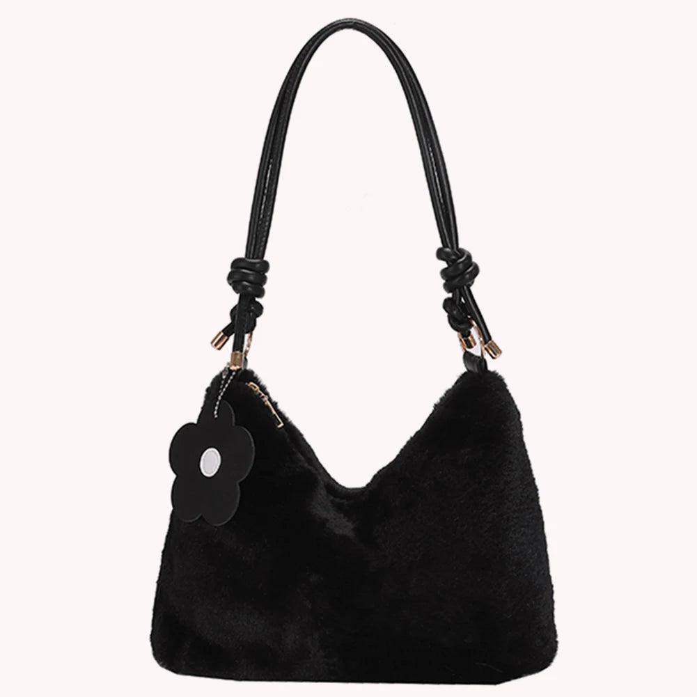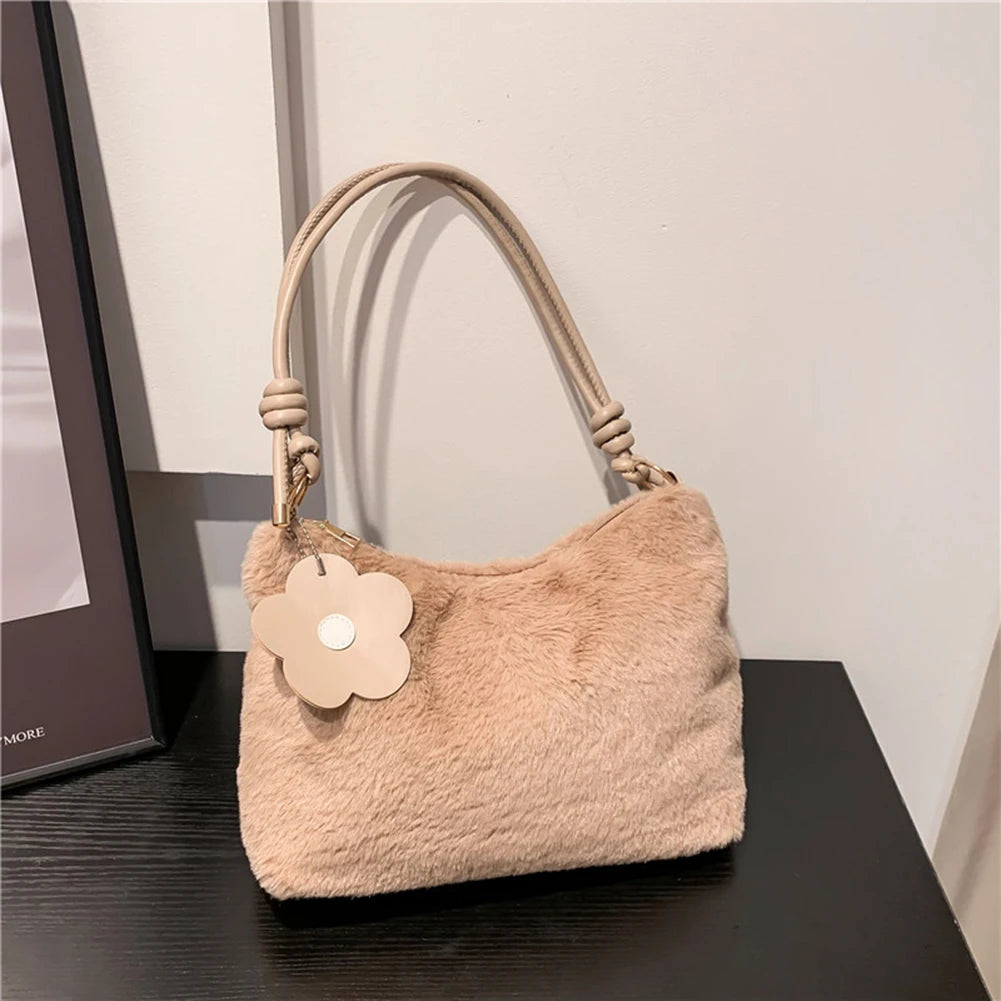 Stay stylish and organized with this plush crossbody bag featuring a flower pendant. Perfect for autumn and winter, this bag is adjustable, soft, and solid.