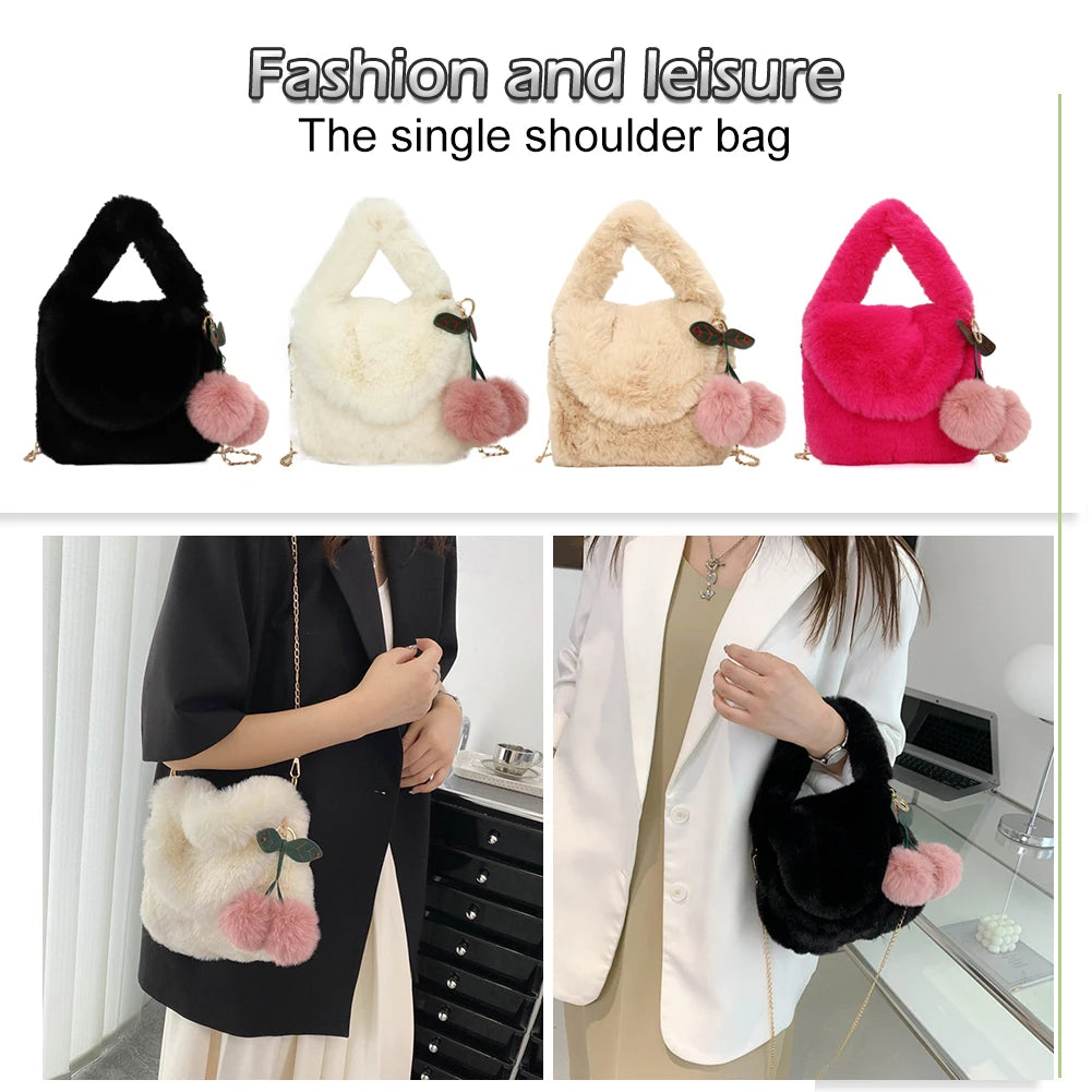 Stay stylish this season with this fluffy satchel bag featuring a cute pompom pendant and soft plush material. Perfect for travel or everyday use.