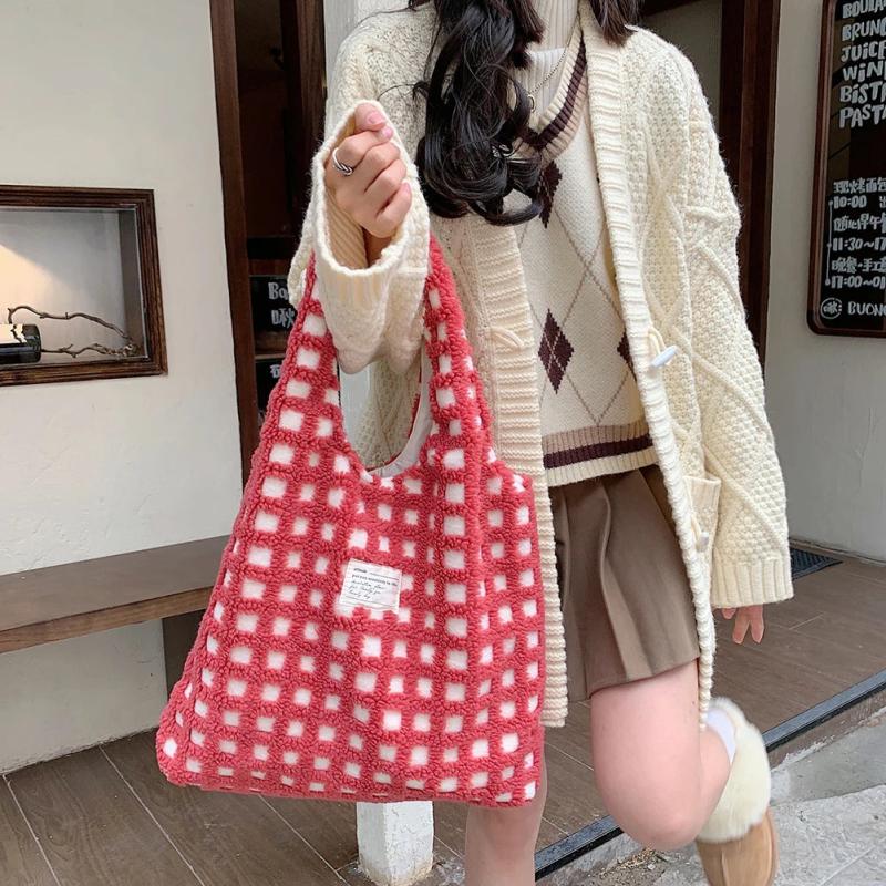 Plush Shoulder Bag Waffle Plaid Top-handle Bag Large Capacity Street Travel