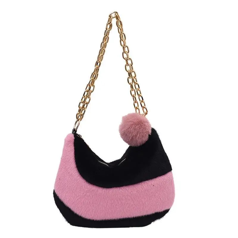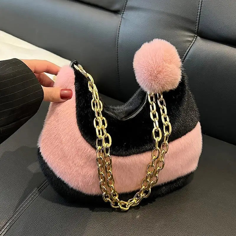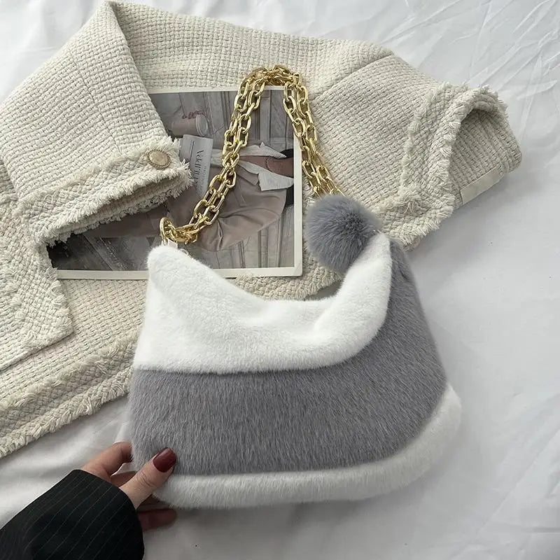 This Fall Winter Contrast Plush Bag offers an advanced texture and style. It features a chain shoulder strap and is perfect for adding a touch of luxury to your outfit.