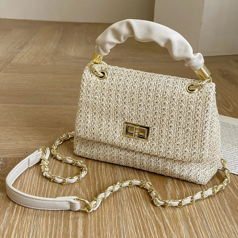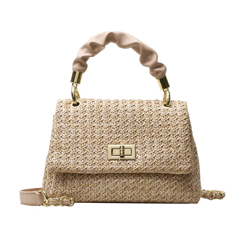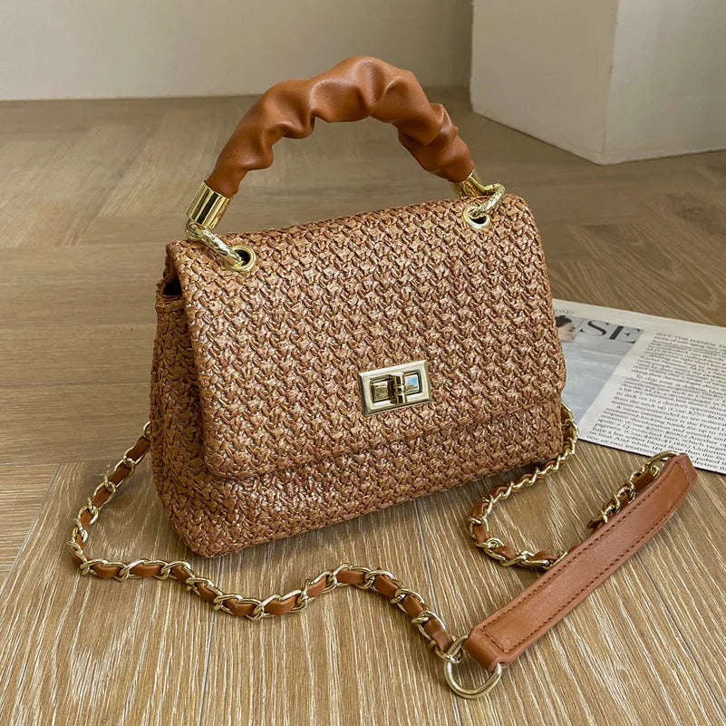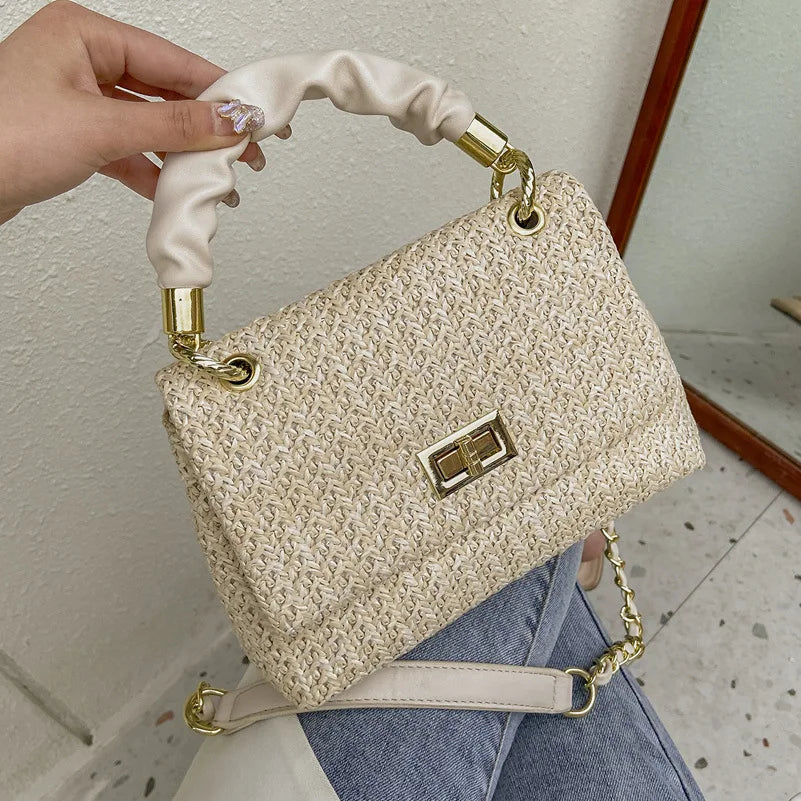 A stylish and compact straw bag perfect for carrying essentials on the go.