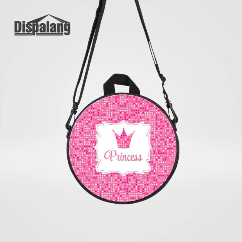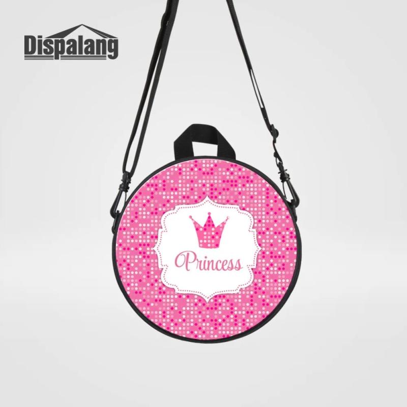 Adorable mini circular messenger bag with princess crown print, perfect for kindergarten. Ideal round schoolbag for young girls.
