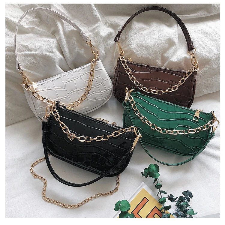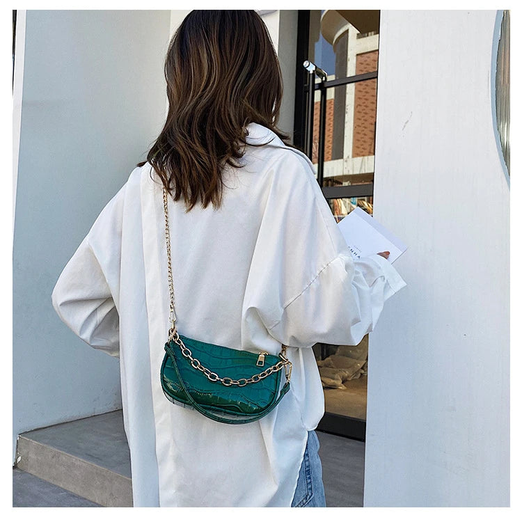 Stylish underarm messenger bag made of PU material with printed pattern, includes 2 chain shoulder straps for versatile wear.